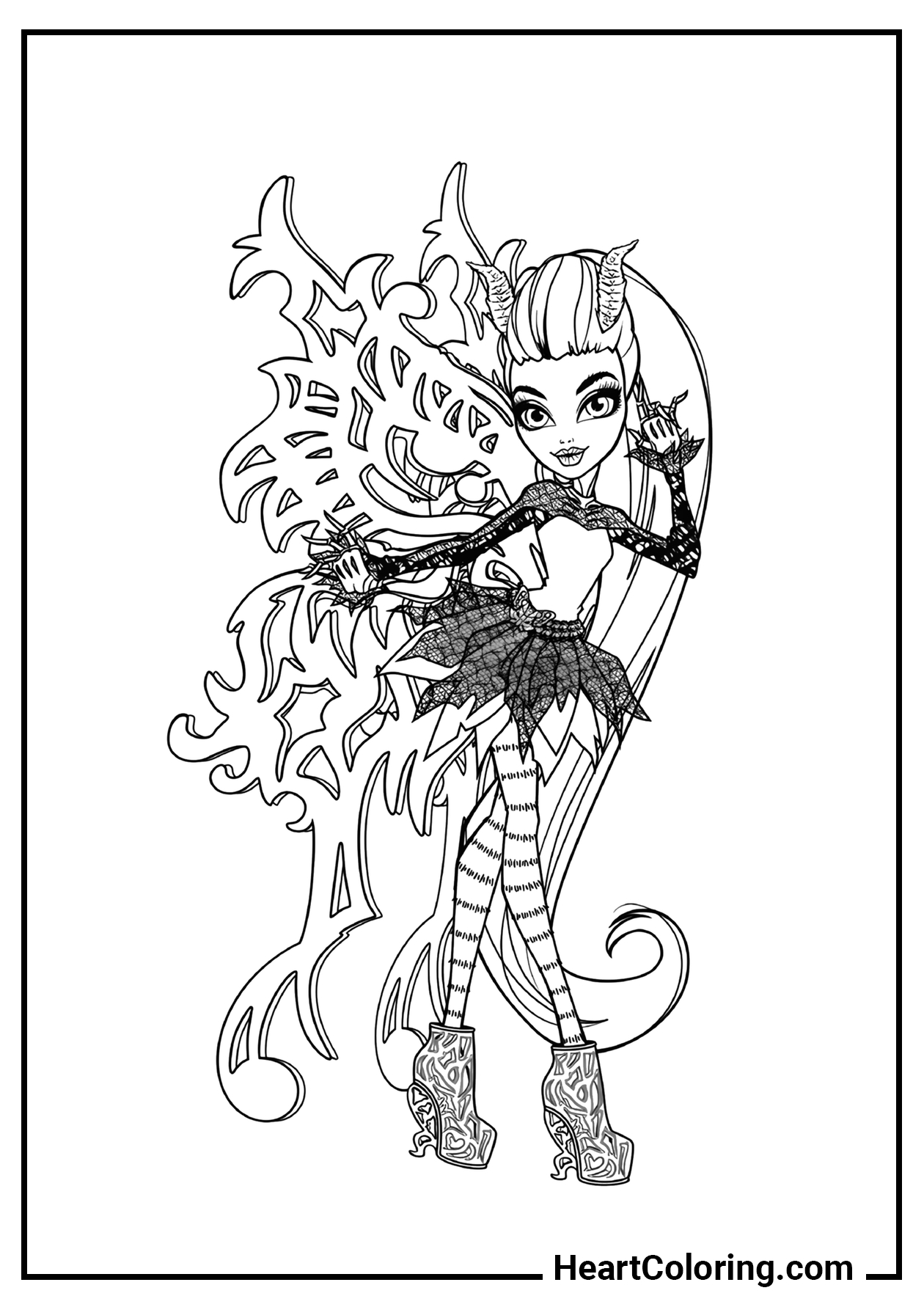 This coloring page features Deuce Gorgon and Cleo de Nile. Yes, you guessed it — they’re dating! Their relationship isn’t always smooth, but it’s definitely interesting to watch.