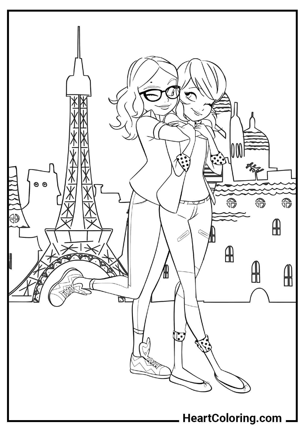 Na kolejnym obrazku Biedronka i Czarny Kot stoją po przeciwnych stronach Wieży Eiffla. Ta kolorowanka doskonale pokazuje ich gotowość do obrony miasta przed Władcą Ciem, mimo że ich postawy wydają się pełne spokoju i pewności siebie.