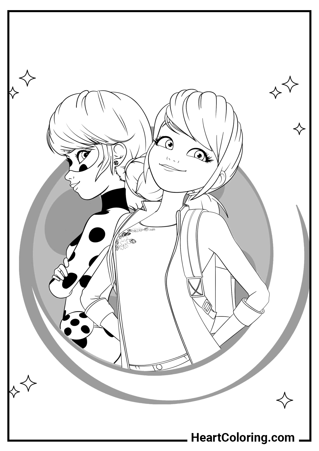 Oto Biedronka! Po lewej stronie widzimy ją jako odważną superbohaterkę, a po prawej – jako zwyczajną uczennicę Marinette, którą jest w wolnym czasie, gdy nie ratuje Paryża.