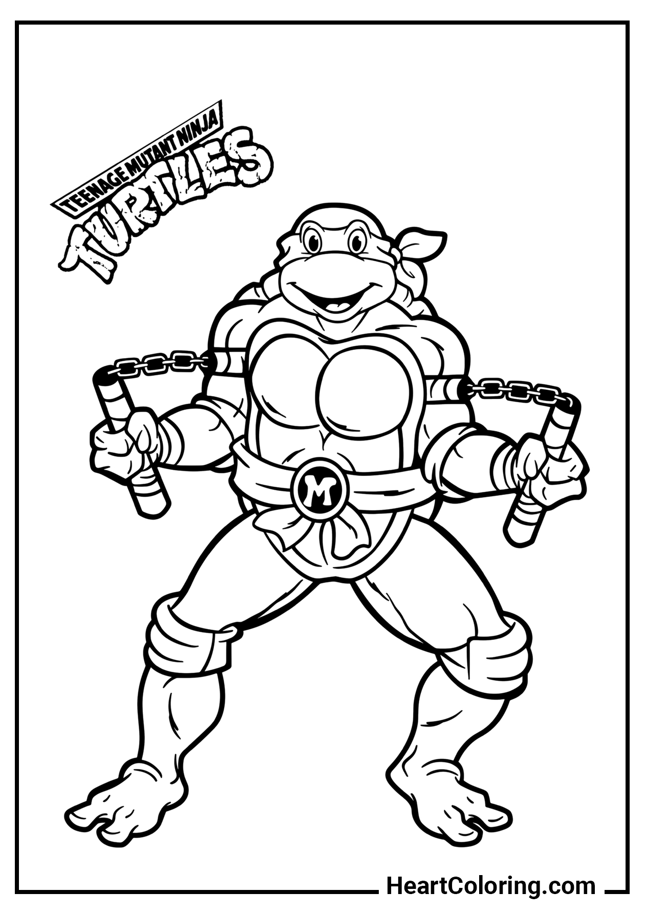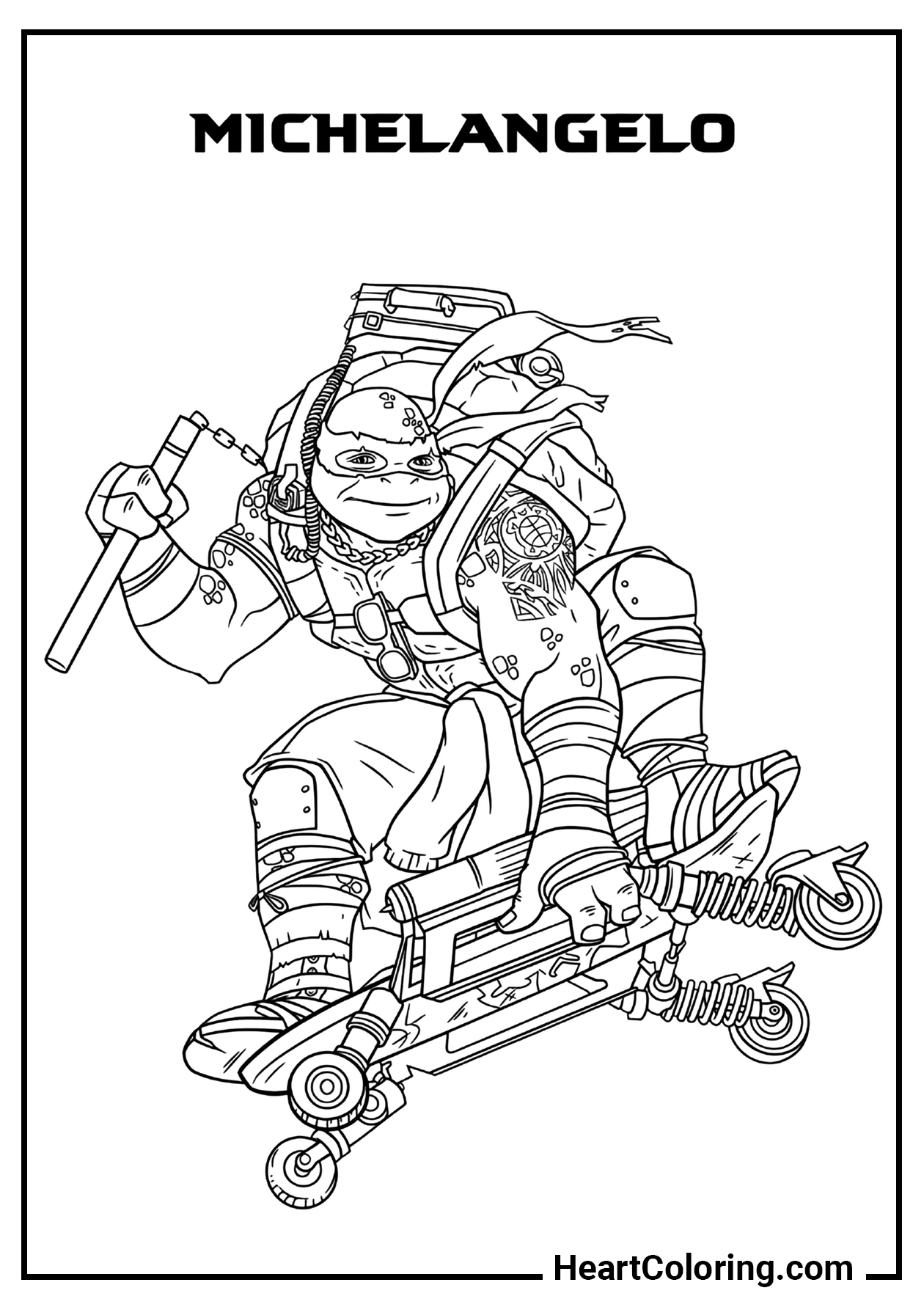 Michelangelo to najmłodszy i najbardziej wesoły z żółwi. Zamiast trenować, woli żartować i dobrze się bawić. Nosi pomarańczową maskę i walczy nunchaku. Jego energia i humor potrafią rozładować każdą sytuację.