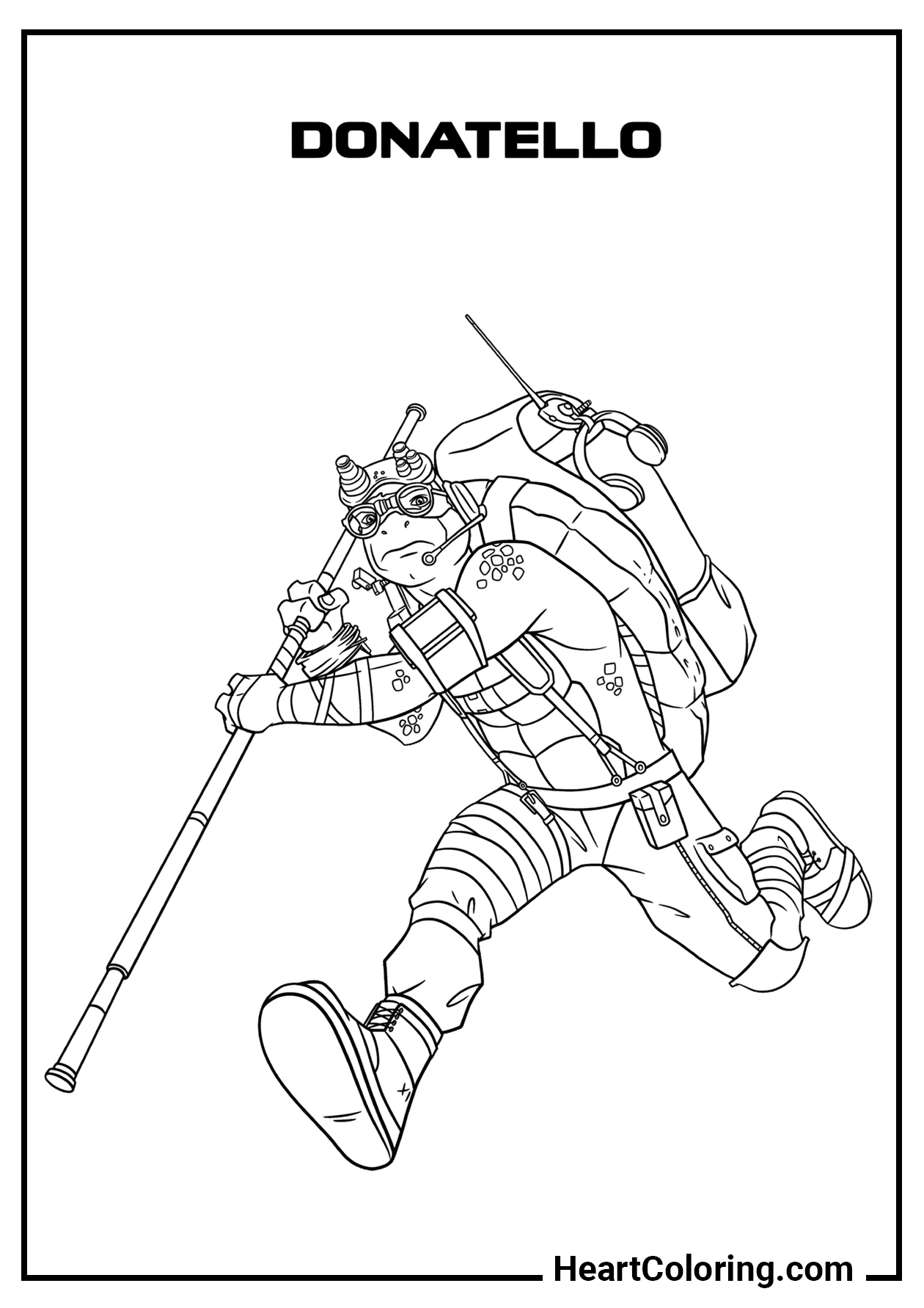 Poznaj Donatella – trzeciego z rodzeństwa i zastępcę lidera. Nosi fioletową opaskę i walczy długim kijem Bo. Jest prawdziwym geniuszem, który tworzy gadżety i sprzęt pomagający Żółwiom w walce ze złem.