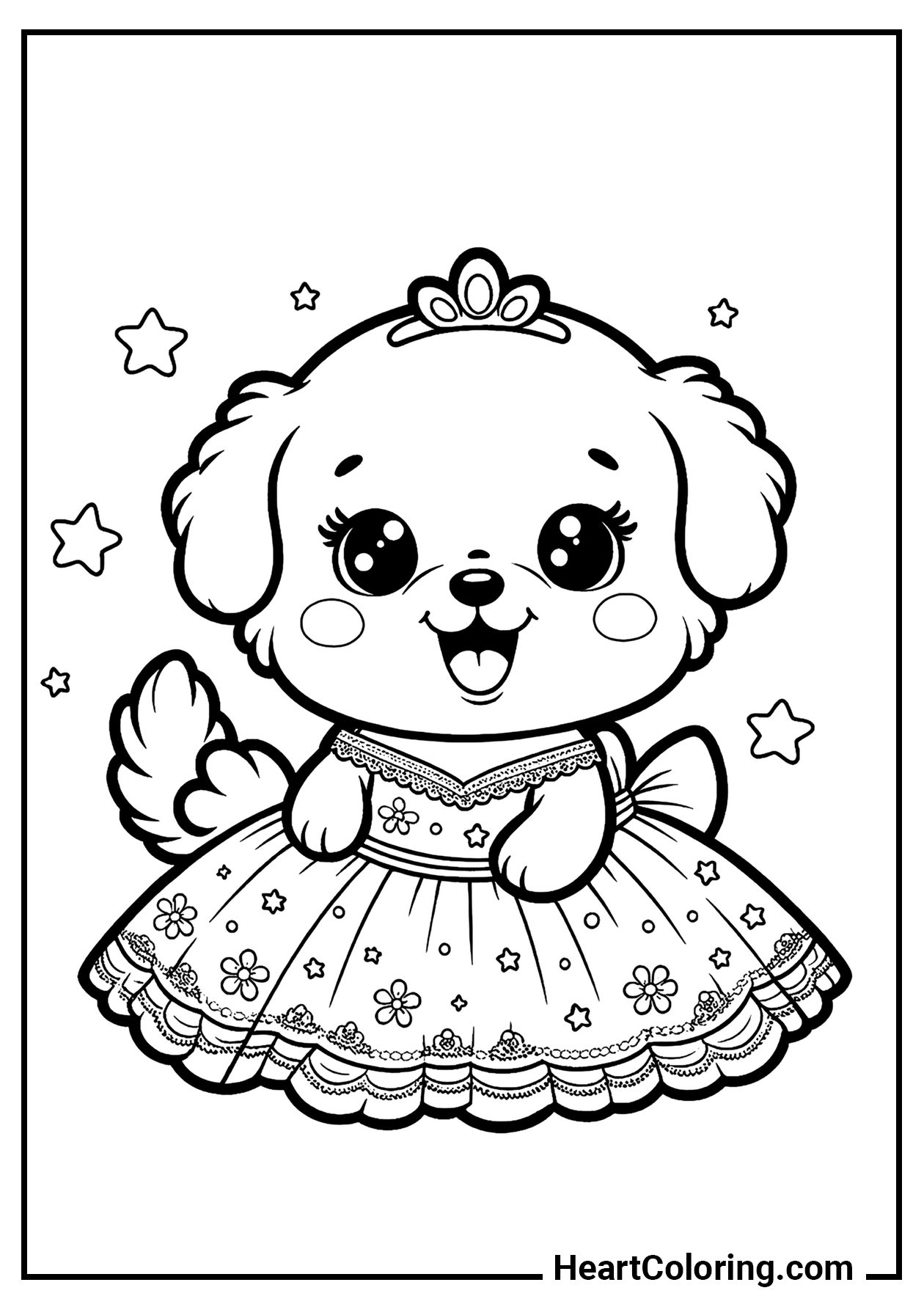 Spójrzcie tylko na tę prawdziwą psią księżniczkę! Ma na sobie modną obróżkę z wisiorkiem w kształcie bucika, błyszczącą tiarę i charakterystyczną łatkę w formie odcisku łapki.