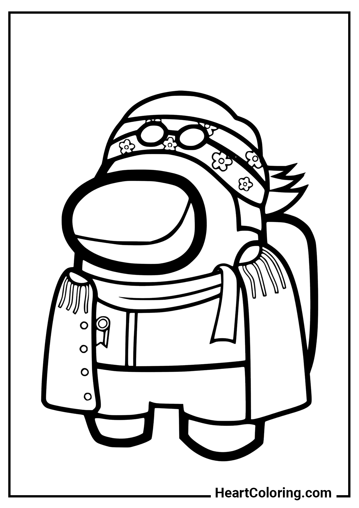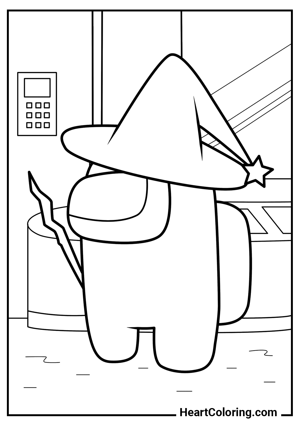 Começamos nossa jornada com uma página de colorir que ilustra perfeitamente a jogabilidade. Aqui, um dos impostores atira em um membro da tripulação, enquanto outro personagem com uma coroa testemunha o crime.