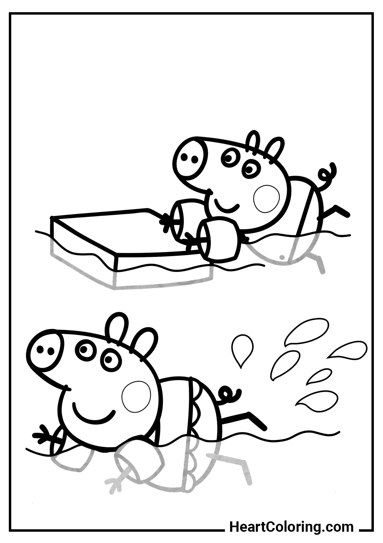 Встречайте младшего братика Свинки Пеппы – Джорджа. На этой раскраске он собирается искупаться. К сожалению, поросёнок не умеет плавать, поэтому ему приходится использовать небольшие поплавки в дополнение к купальнику.